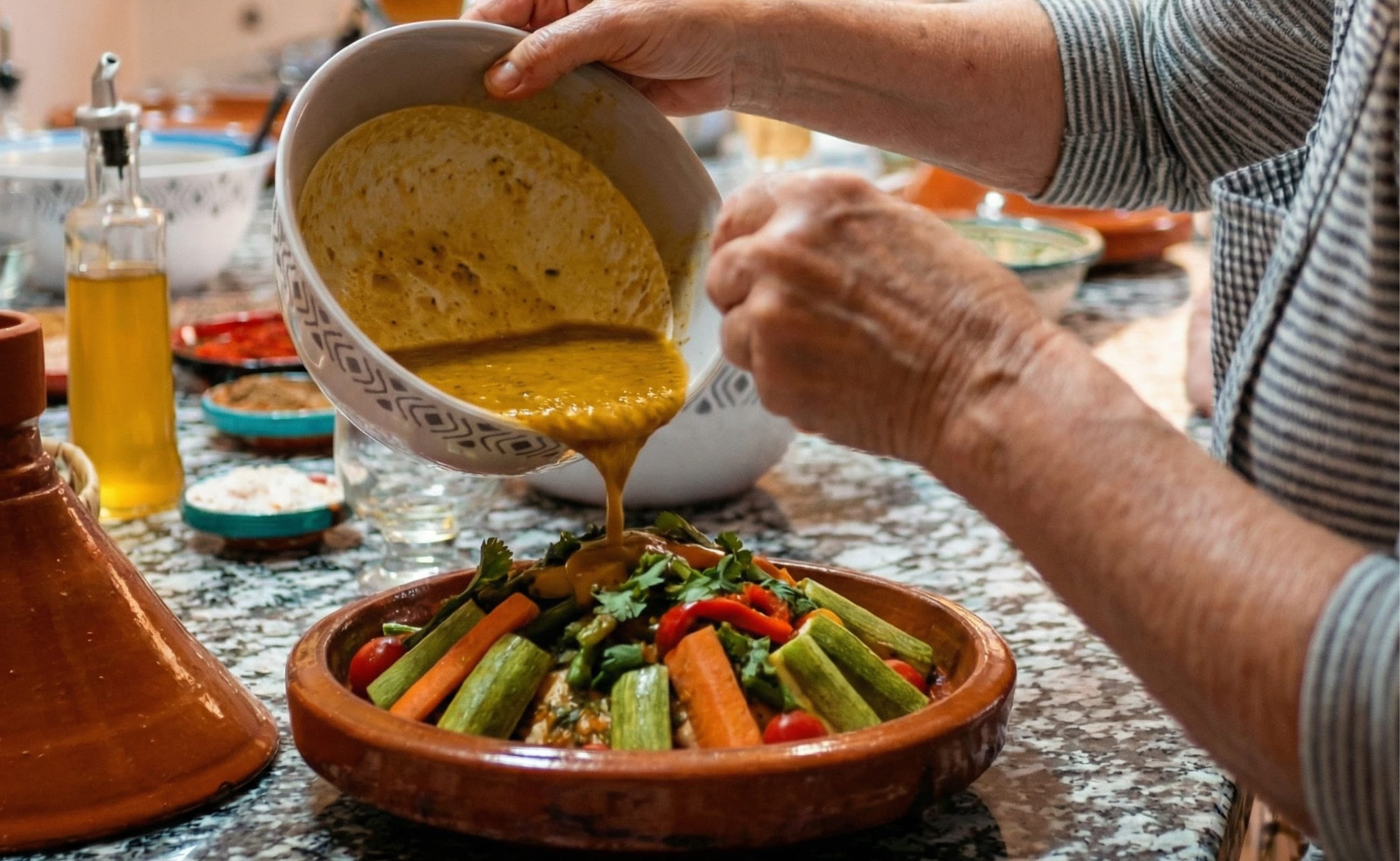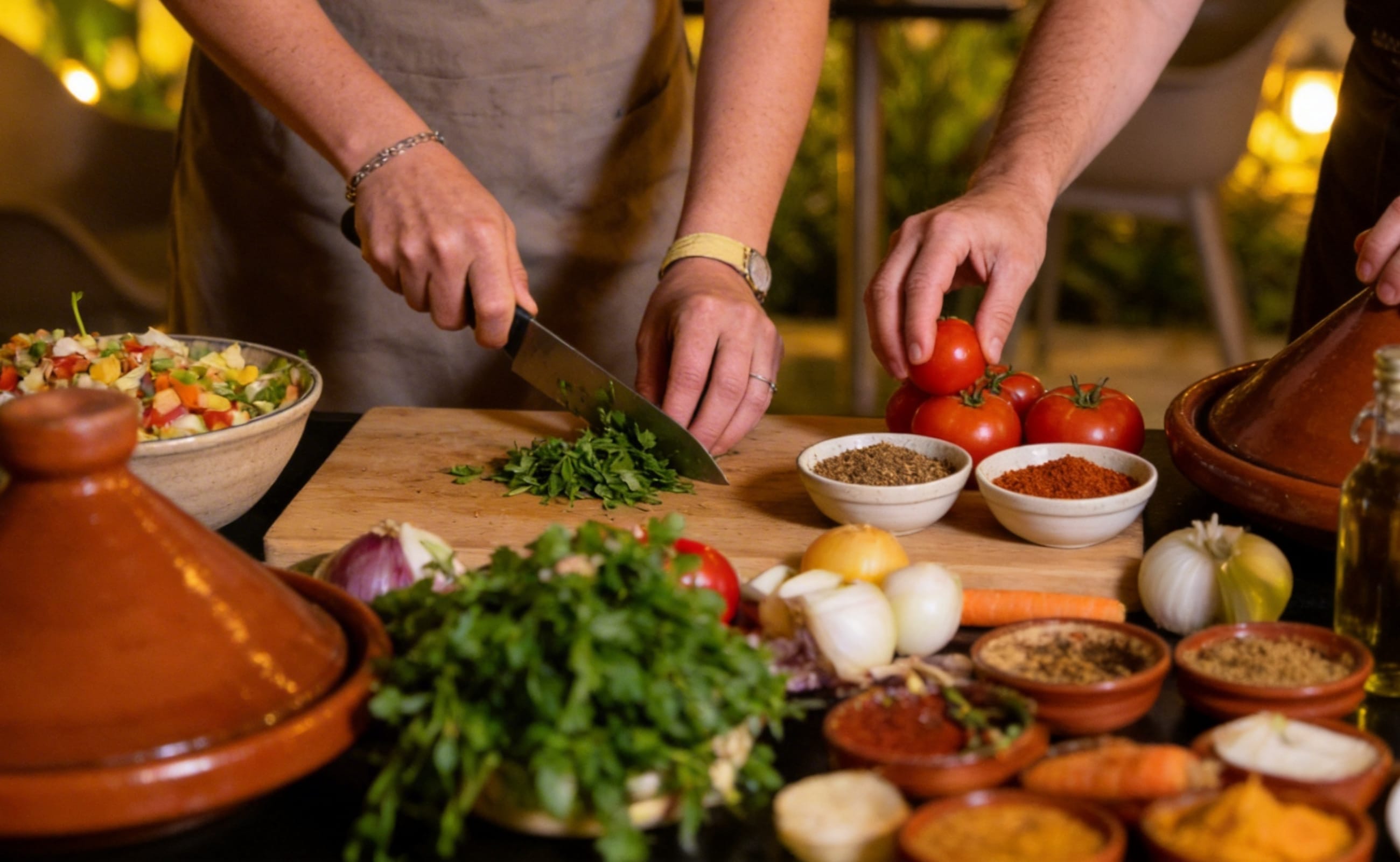 After the garden experience, guests move to the kitchen area where our chef introduces Moroccan spices, cooking techniques, and traditional preparation methods. Participants actively take part in preparing and cooking the dishes step by step, making this a fully hands-on culinary experience suitable for all levels.